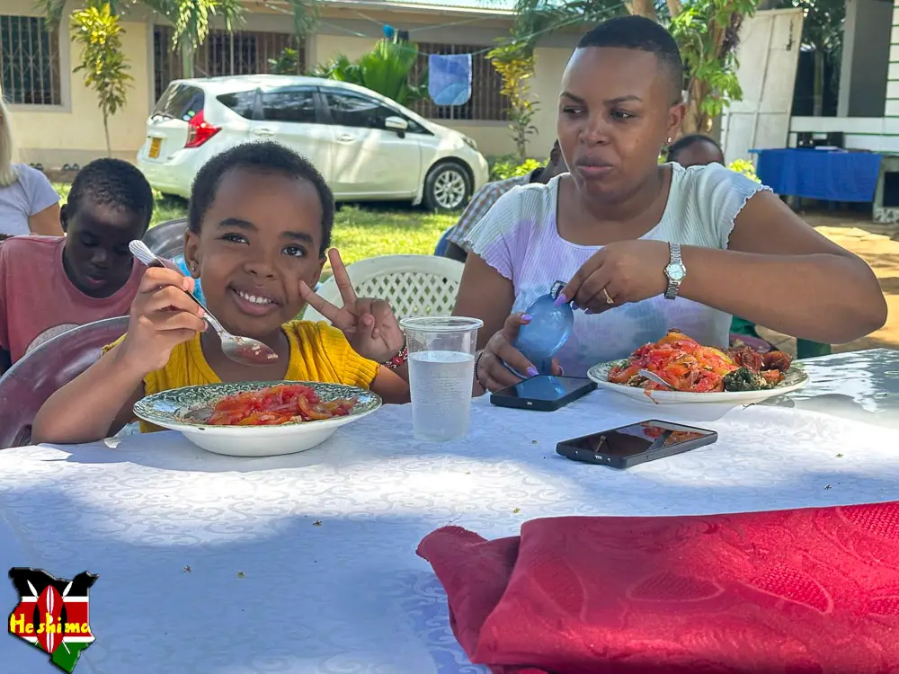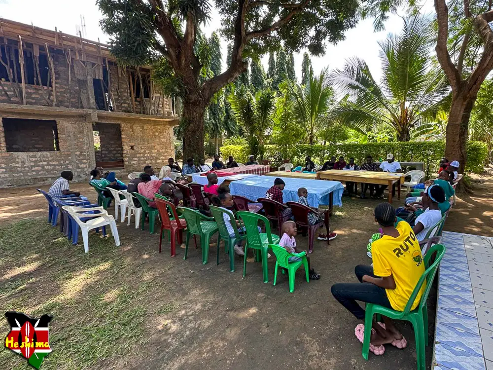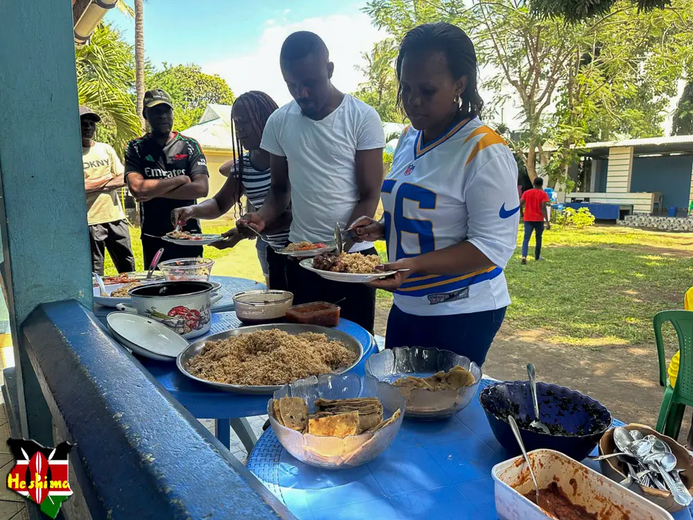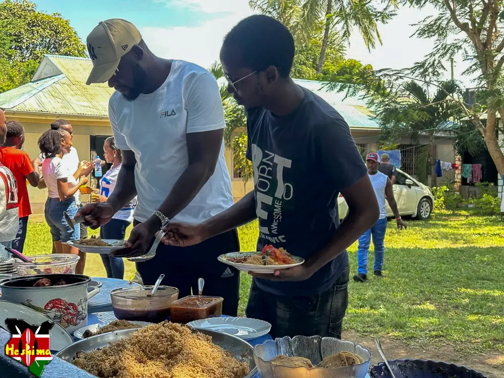 Nach einer herzlichen Vorstellungsrunde durften wir gemeinsam essen. Dank der großzügigen Unterstützung der Gruppe und der großartigen Arbeit unserer Köchinnen und Köche wurde ein echtes Festmahl zubereitet – mit traditionellen Gerichten wie Pilau, Chapati, Spinat, Hühnchen, frischen Tomaten und Zwiebeln. Zum Nachtisch gab es einen frischen Obstsalat. Besonders schön: Unsere Gäste bestanden darauf, das Essen selbst zu servieren – eine Geste, die von Herzen kam.